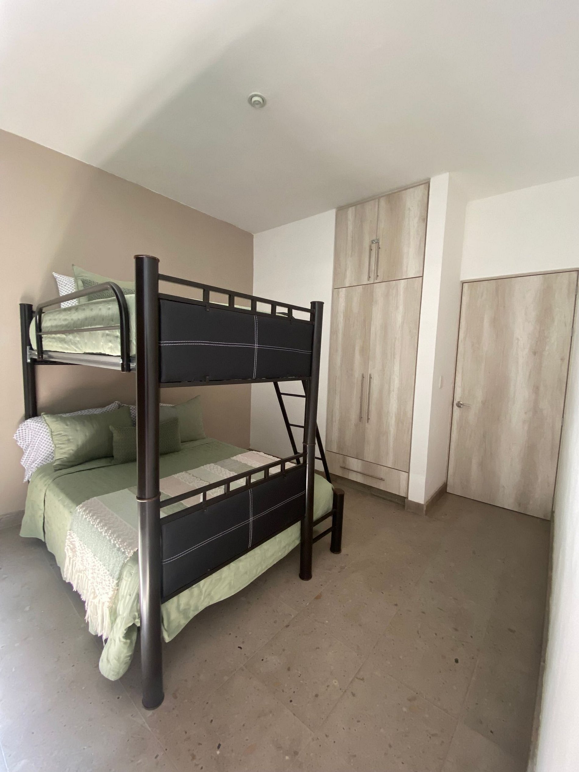 La recámara principal tiene una cama King Size ideal para descansar después de recorrer la ciudad. La segunda recámara incluye una litera con cama matrimonial abajo y cama individual arriba, perfecta para alojar hasta 3 personas con comodidad. En total, el espacio es ideal para hasta 5 huéspedes.